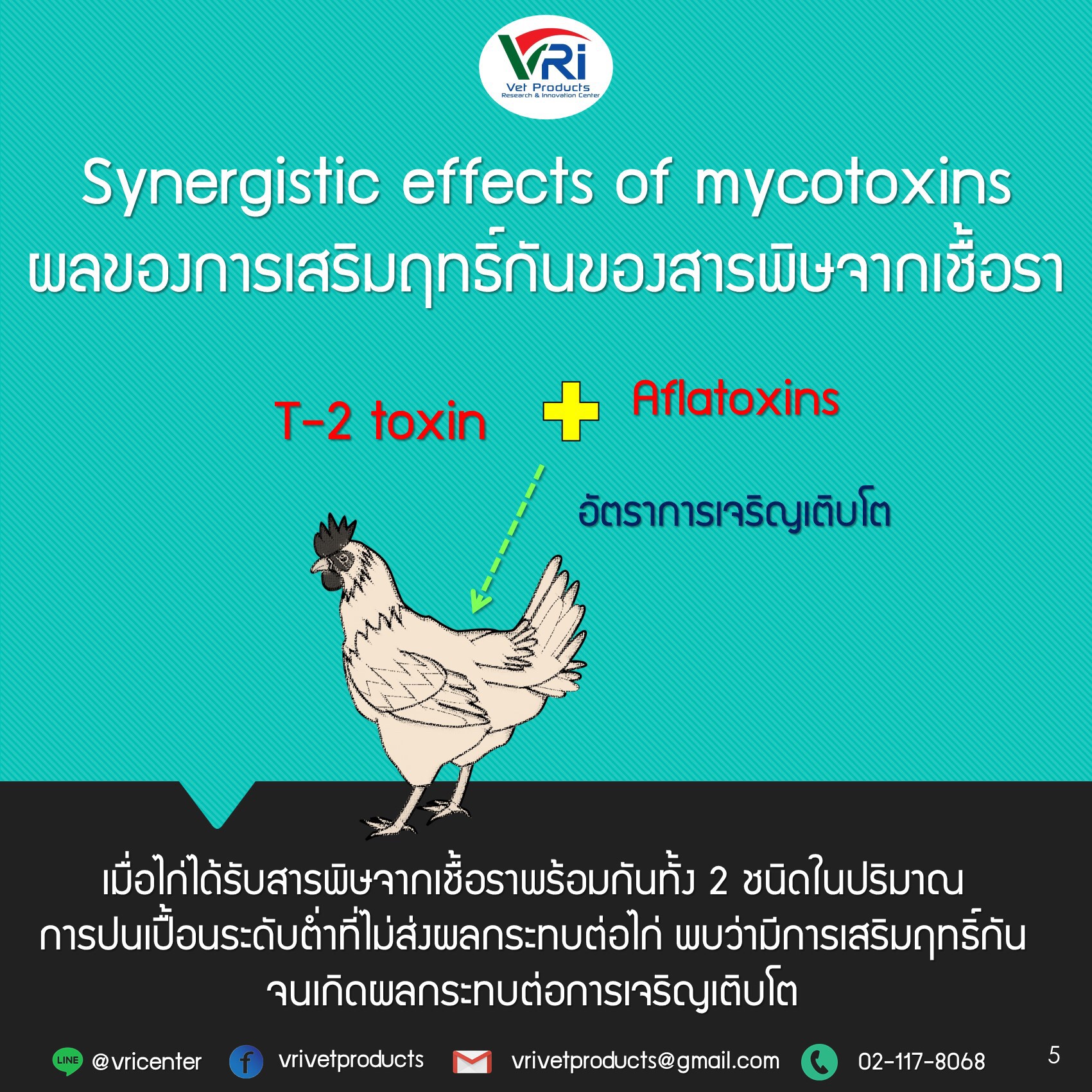 ทั้งสุกรและสัตว์ปีกได้รับสารพิษกลุ่ม Aflatoxins ร่วมกับ Fumonisin B1 จะพบว่าเกิดการเสริมฤทธิ์กันจนทำให้เกิดความรุนแรงมากกว่าการได้รับสารพิษชนิดเดียว ในไก่พบการเกิดรอยโรคที่ตับ ตับมีลักษณะซีดเหลือง และยังส่งผลต่อคุณภาพของไข่ไก่ด้วย ส่วนสุกรมีผลต่อระบบภูมิคุ้มกัน ปอดบวม และเกิดรอยโรคที่รุนแรงมากขึ้นเช่นกัน อย่างในสัตว์ปีก ที่ได้รับสารพิษจากเชื้อรากลุ่ม Aflatoxins ร่วมกับสารพิษจากเชื้อรา T-2 toxin ในปริมาณการปนเปื้อนระดับต่ำที่ไม่ส่งผลกระทบต่อสัตว์ปีก พบว่ามีการเสริมฤทธิ์กันจนเกิดผลกระทบต่อการเจริญเติบโต และเมื่อสัตว์ปีกได้รับ สารพิษจากเชื้อรากลุ่ม Aflatoxins ร่วมกับ Ochratoxin A จะส่งผลให้เกิดความผิดปกติของตัวอ่อน เกิดผลกระทบต่ออัตราการเจริญเติบโตและเกิดความเป็นพิษที่ไตรุนแรงขึ้น สุดท้ายจากบทความนี้ VPG มุ่งหวังให้ผู้อ่านมีความรู้ความเข้าใจต่อความรุนแรงและตระหนักถึงผลกระทบของปัญหาการปนเปื้อนของสารพิษจากเชื้อราที่จะตามมา