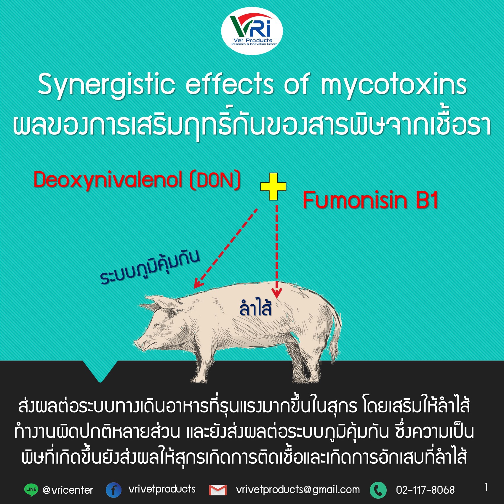สารพิษจากเชื้อราที่มีปนเปื้อนในอาหารเป็นเรื่องสำคัญที่เราต้องตระหนัก และมีอันตรายต่อประสิทธิภาพและสุขภาพของสัตว์ เราพบว่าสารพิษจากเชื้อรามากกว่า 1 ชนิด จะส่งผลกระทบต่อสัตว์ที่รุนแรงกว่าเดิม อาการป่วยที่ปรากฎบางครั้งจะไม่เหมือนกับสัตว์ได้รับสารพิษแค่ชนิดเดียว ซึ่งเป็นการยากในการที่จะวินิจฉัยโรคได้ และโอกาสเกิดโรคอื่นๆ ตามมาก็จะเป็นไปได้สูง ดังนั้น VPG ขอยกตัวอย่างความร้ายแรงของสารพิษจากเชื้อราเมื่อมีการเสริมฤทธิ์กันในสุกรและสัตว์ปีก ดังนี้